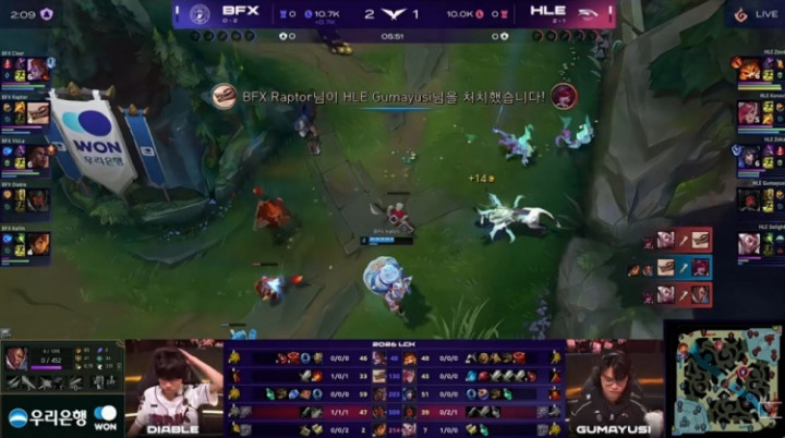 [13:35]Raptor下路带队入侵HLE野区锁头开团被Zeka击杀,Kanavi蔚锁头Kellin米利欧,后者所有技能都交在保护Raptor冥犬撤退,但Zeka妖狐带队爆轰四杀,HLE打出0换5,经济反超2.7k。