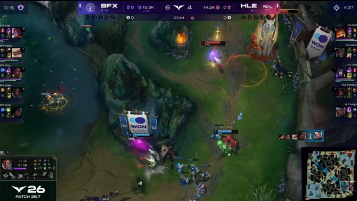 [7:26]上路宙斯纳尔下路4v4,Zeka狐狸进场先拿双杀,Vicla梅尔随后来下反手也拿双杀,上路宙斯大纳尔满血越塔失误被Clear阿萝拉丝血塔下反杀,BFX打出2换4,经济小领先1k。