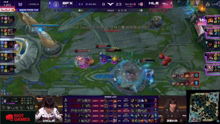 [20:59]HLE中路推进,Zeka妖狐进场轻松双杀,上路Kanavi蔚追击Vicla梅尔得手将其单杀,HLE打出0换4,经济领先
