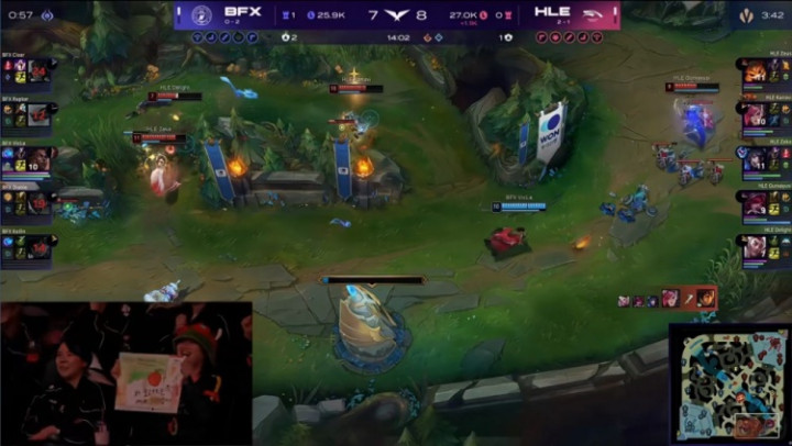 [22:53]下路团战,Zeka妖狐走位激进先被击杀,小吕布霞配合宙斯大纳尔出击,HLE打出1换5,一波推平BFX基地拿到比赛胜利。