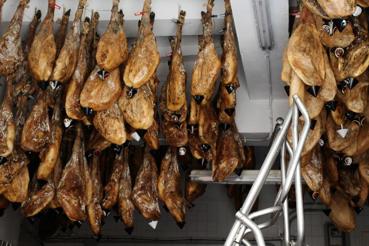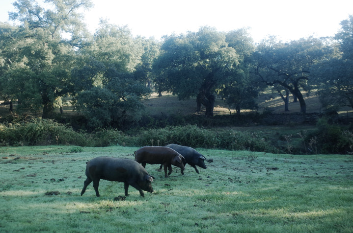 让这一猪种声名远播的,当然是jamónibérico——伊比利亚火腿。含着丝丝缕缕半透明油脂的深红色火腿薄片,口感浓郁又细腻绵密,甜美的脂肪带着坚果和森林香气流动在肉质中。萨拉曼卡省的这片风水宝地,海拔千米,干燥冷冽,正是伊比利亚火腿的三大原产地之一,是享誉世界的火腿厂牌费尔明(Fermín)与小何塞(Joselito)的故乡。