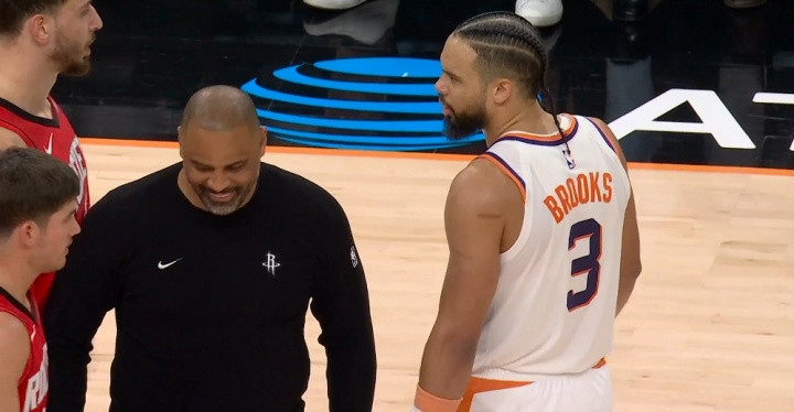 比赛中,狄龙故意撞倒亚当斯,乌度卡一开始跟狄龙激烈对峙,但骂两句笑场了...