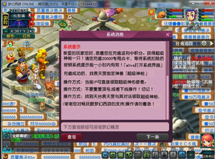 说是在充值返利中获得一只超级神柚,要再冲20000点专用点,就可以领取了。下面还有三个提醒,不要下线顶号,不要换IP,找天台袁天罡对话领取。